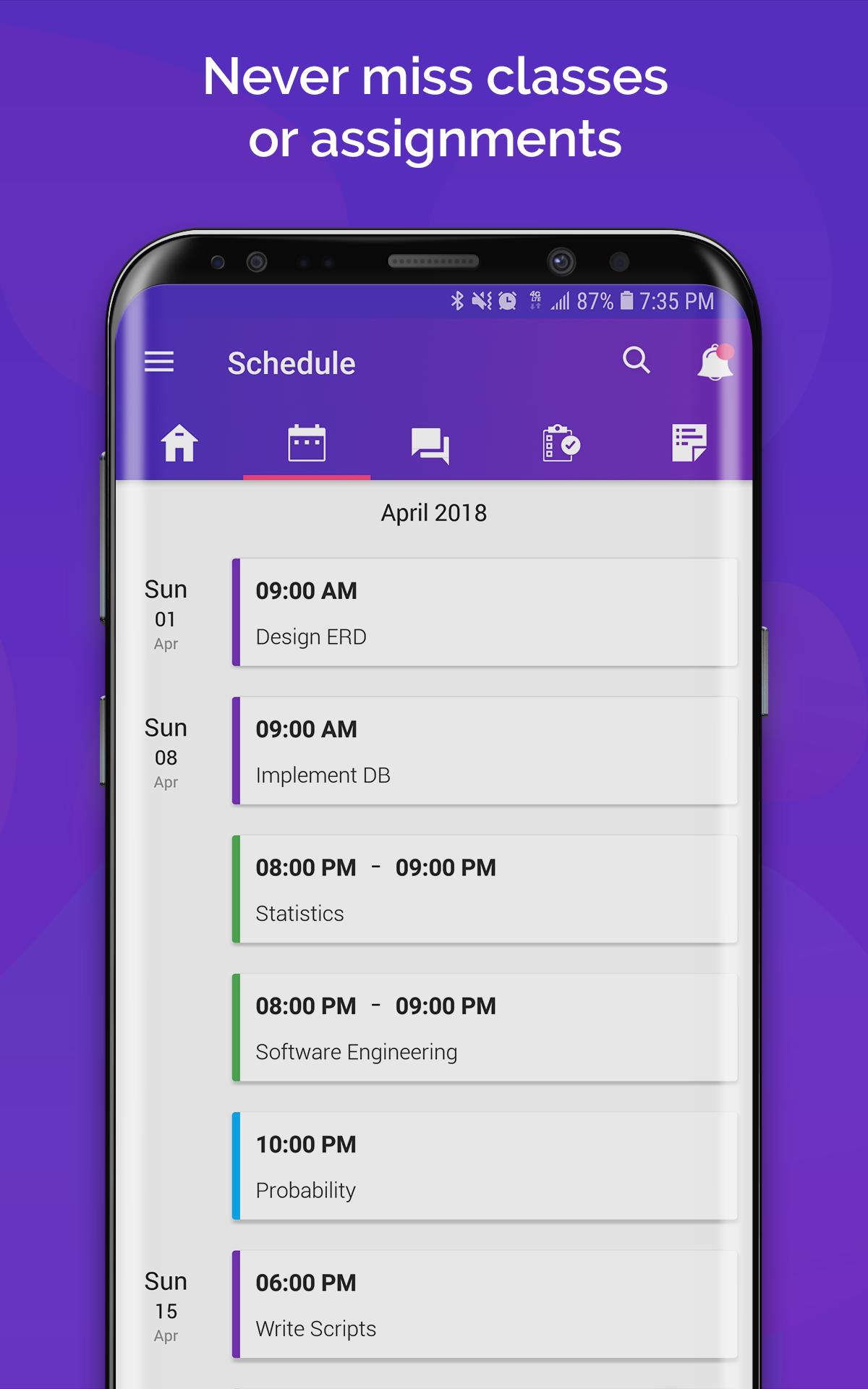- Create assignment and receive reminders before they are due.