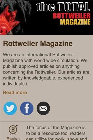إجمالي مجلة الروت وايلر هو النشر الدولي مع الدورة الدموية في جميع أنحاء العالم. محور المجلة هو أن تكون موردا يمكن للقراء أداة تستخدم للعمل، وتظهر، ومعلومات عن سلالة الروت وايلر. يتم كتابة مقالاتنا من قبل أفراد من ذوي الخبرة وتغطية الأحداث الروت وايلر في جميع أنحاء العالم، والتدريب لجميع الأحداث الأداء، والتدريب للكلاب رفيق، الكلاب العاملة (بما في ذلك K-9، والبحث والانقاذ، والكلاب الخدمة)، والصحة والتغذية، والعديد من المواضيع الأخرى الفائدة لأصحاب الروت وايلر.
