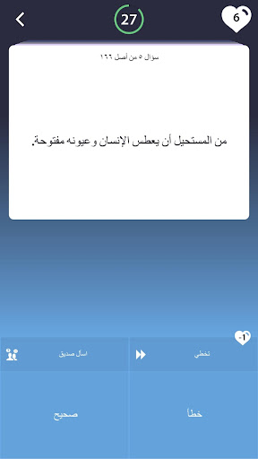 إذا كنت من محبي لعبة مسابقة عامة أو اسئلة مسابقة عامة، تحدى مستخدمي اللعبة من جميع أنحاء العالم، واقرأ العديد من الحقائق المفيدة التي تم تسمع بها من قبل! اقرأ حقائق صحيحة عن الرياضة والتاريخ والحيوانات والجغرافيا والعديد من الجوانب الأخرى! تطبيق لعبة صح ام خطأ هي فرصتك الفريدة لتطوير معرفة عامة ضعيفة، وقضاء أجمل الأوقات! حمل تطبيق لعبة صح ام خطأ، وابدأ اللعب الآن!