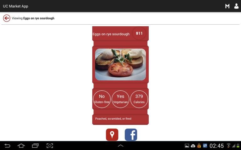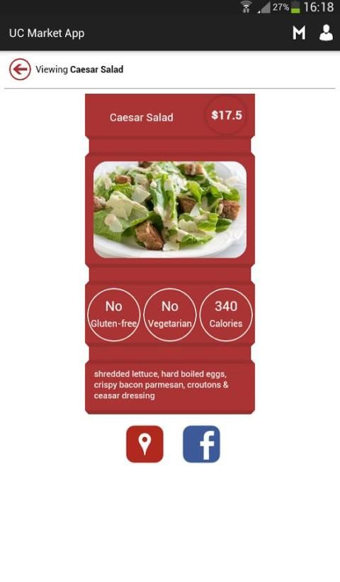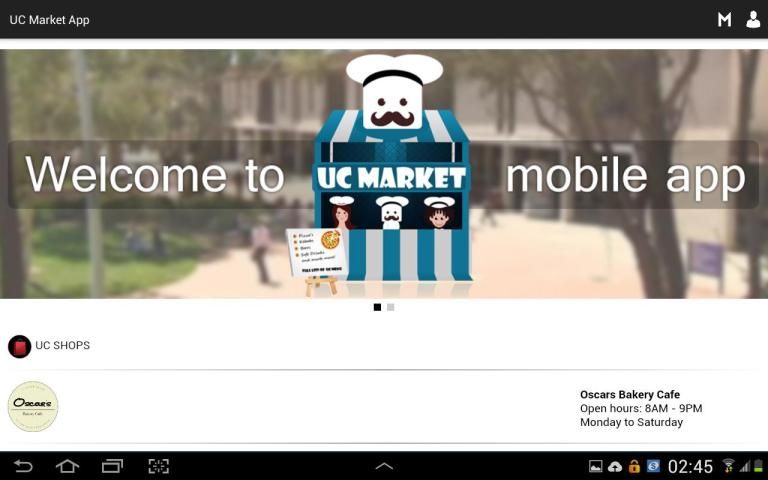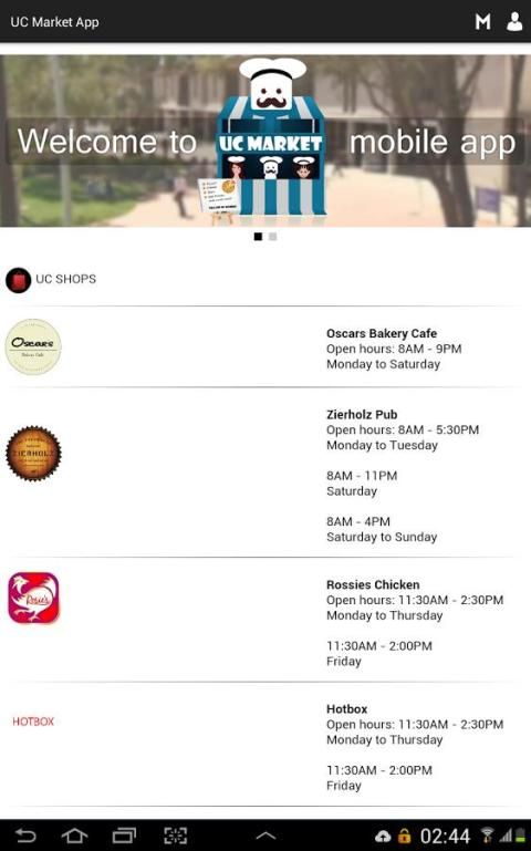 سوف تطبيقات الهاتف المتحرك UC السوق تساعد الناس للبحث عن القائمة كل محلات الوجبات السريعة التي تقع على جامعة كانبيرا الحرم الجامعي. مع واجهة المستخدم ودية المحمول وسوف تظهر للجمهور المعلومات والبيانات القيمة مثل أسعار كل المواد الغذائية والمشروبات، وصف الطعام، إذا الغلوتين الحر، إذا به نباتي، وعدد السعرات الحرارية لكل بند هذا العرض المحل.