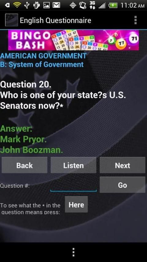 هذا هو الاستبيان أنجزت في اللغة الإنجليزية (100 الأسئلة والأجوبة) على التربية المدنية (التاريخ ونظام الحكم) لتجنيس الولايات المتحدة.