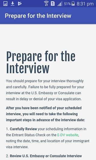 بعد أن استعرضت لمركز كنتاكي القنصلي المكتملة DS-260، قد تتلقى رسالة بريد إلكتروني من KCC أن أخبركم أن مقابلة وكان من المقرر في السفارة الأمريكية أو القنصلية الذي حددته على النموذج الخاص بك DS-260. سوف البريد الإلكتروني تطلب منك تسجيل الدخول إلى معرفة حالة والوافدين على الموقع الإلكتروني تأشيرة التنوع (E-DV)، وذلك باستخدام DV رقم تأكيد دخولك، لعرض التاريخ والوقت والمكان من المقابلة. طباعة هذه المعلومات أن تأخذ معك إلى المقابلة. سوف تحتاج إلى أن يكون حاضرا في المقابلة، وكذلك زوجتك والأطفال (حسب مقتضى الحال) الذين يتقدمون بطلب للحصول على تأشيرة التنوع المهاجرين.