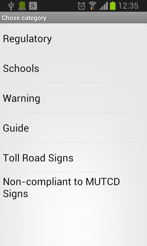 تصفح من علامات الطريق في الولايات المتحدة. كبيرة إذا كنت بحاجة الى ان ننظر لافتة الطريق معينة. التطبيق يمكن أيضا أن تكون مفيدة لممارسة.
