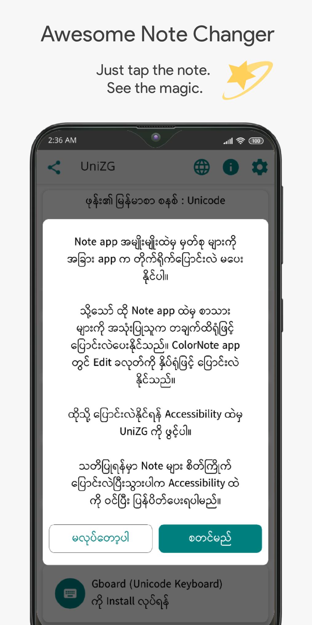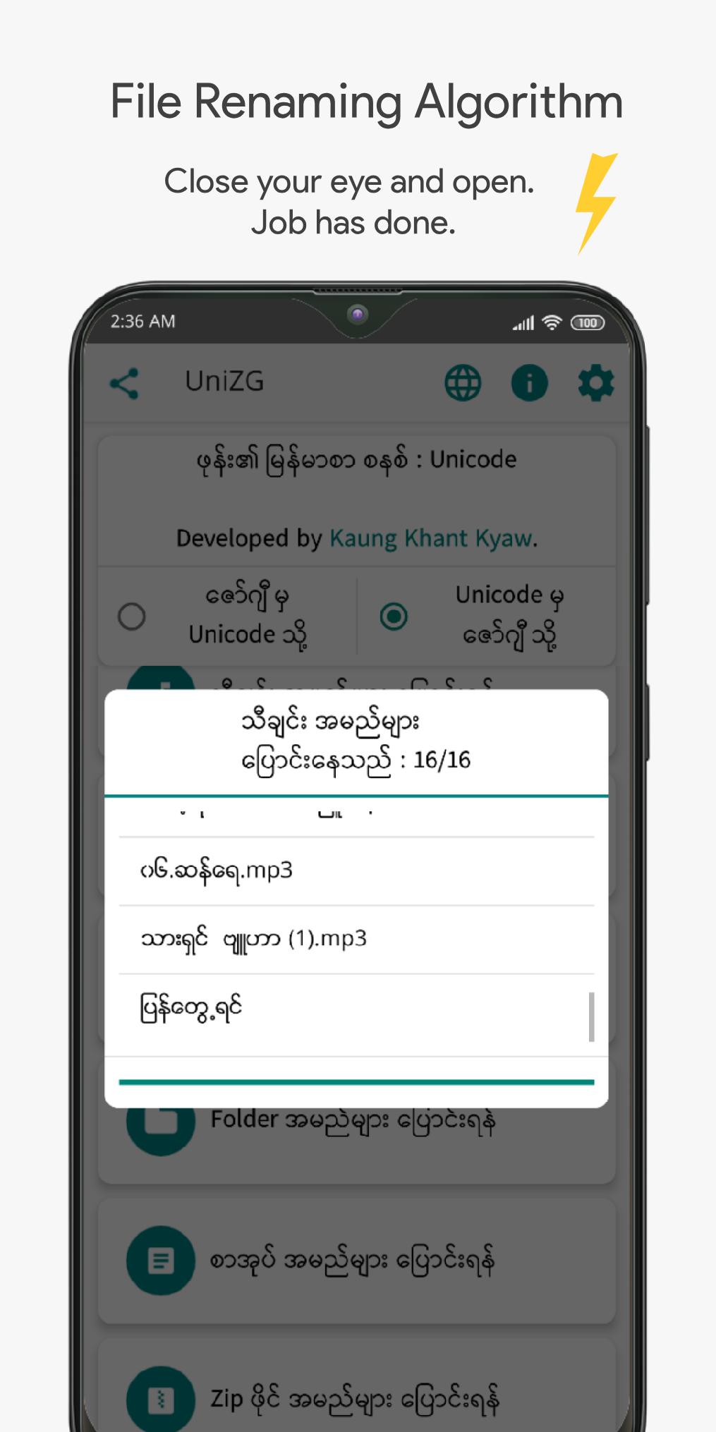 This app can change from Zawgyi to Unicode and Unicode to Zawgyi. Please do not leave application while changing names.
