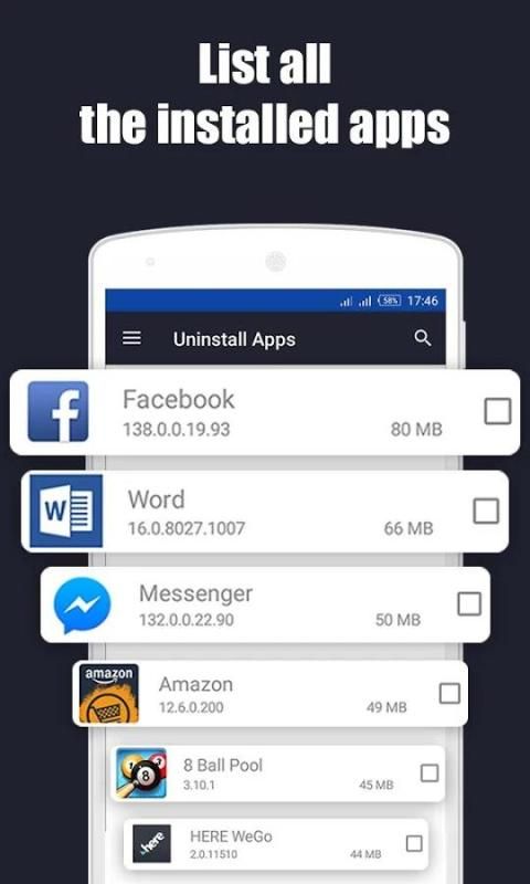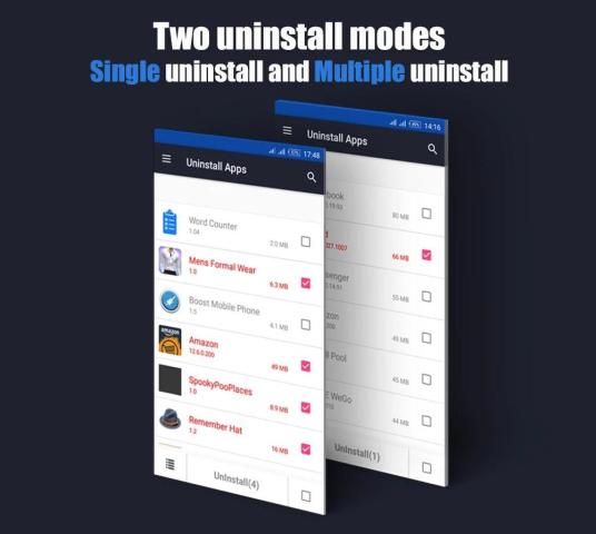 "إلغاء تثبيت التطبيقات: من السهل إلغاء التثبيت والهاتف نظيفة" من السهل جدا للاستخدام، كما يمكنك اختيار التطبيقات واحد أو عدة الذي تريد إزالة وفقط اضغط على زر "إلغاء". في الجزء السفلي من التطبيق، يمكنك أن ترى عدد الطلبات ملحوظة كنت على وشك أن يصدر في حالة إلغاء تثبيت لهم.
