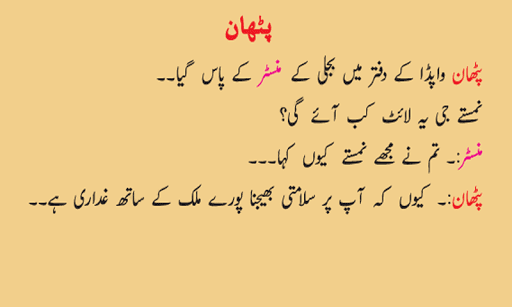 Urdu Jokes Application contain Pathan, Sardar, Bf& Gf and School. Very funny and entertainment jokes and latifay.. This app have lot of Free Funny Jokes in many categories and your can share on Twitter or Facebook. In this free app you will find funny jokes to upload on your Facebook status.