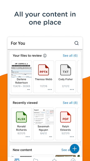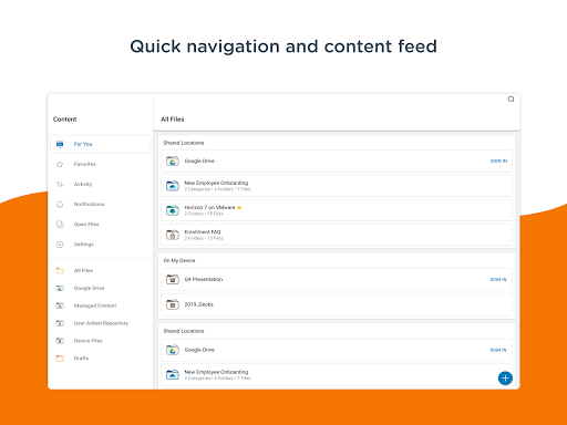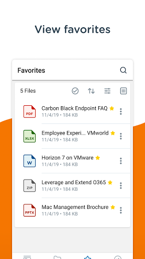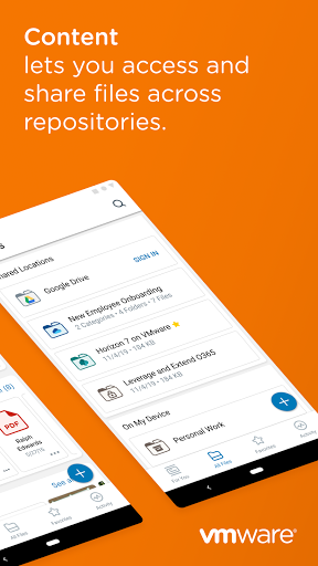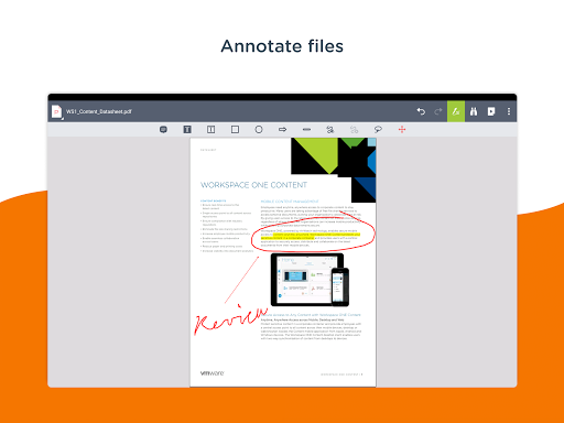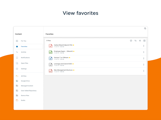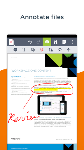 يمكّنك Workspace ONE Content من الوصول بطريقة آمنة إلى كل ملفاتك في أي وقت ومن أي مكان عبر كل الأجهزة. شارك الملفات وحدد تلك المفضلة لديك وتمكّن من الوصول إلى المستندات من دون الاتصال بالإنترنت واعمل على تحرير مستندات Office وأضف تعليقات توضيحية إلى ملفات PDF بسهولة تامة بفضل أدوات التحرير المضمنة.