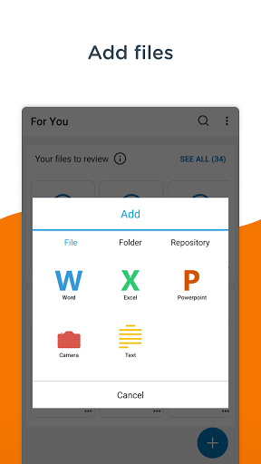 هل تحتاج إلى شيء جديد؟ يمكنك إضافة مستندات أو وسائط أو مجلدات جديدة أو الاتصال بمستودع جديد بسهولة عن طريق الضغط على علامة الجمع الموجودة في الجزء السفلي الأيسر من التطبيق.