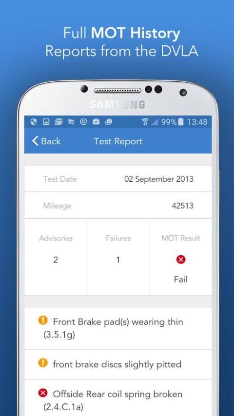 عرض تقرير كامل عن جميع الاختبارات MOT الانتهاء من السيارة. اكتشاف أي مشاكل ميكانيكية السابقة والمشاكل غير المثبتة.