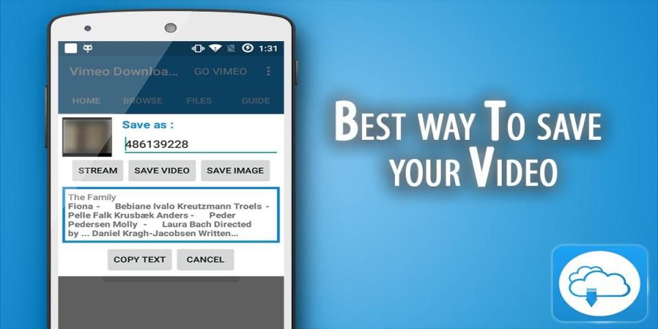 فيميو تنزيل الفيديو هو تطبيق التي تساعد المستخدمين على حفظ الفيديو من فيميو بتنسيق MP4 لتخزين الهاتف، والقدرة على نسخ وصف الفيديو.