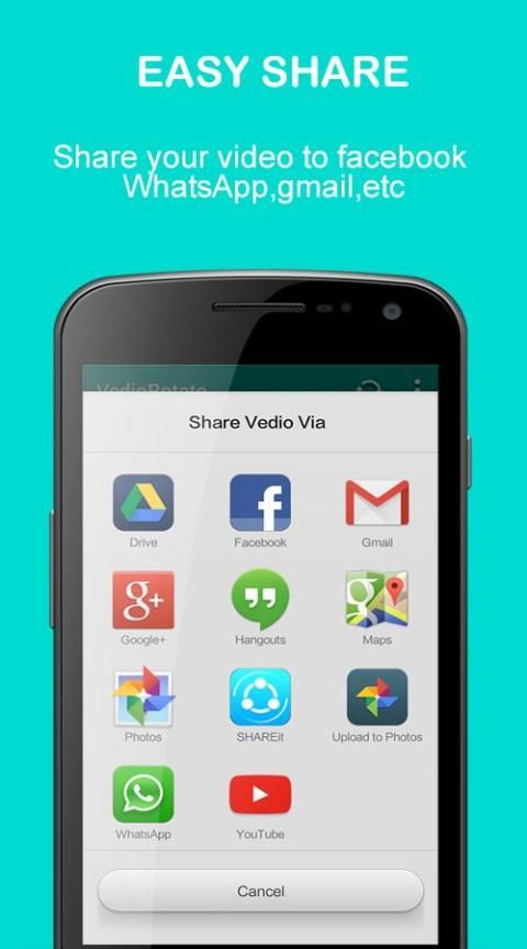 هذا التطبيق هو لتدوير الفيديو في جميع زوايا 90، 180 أو 270 درجة. يمكنك أيضا مشاركة الفيديو تناوب على الشبكات الاجتماعية مثل الفيسبوك، و Gmail، ال WhatsApp الخ