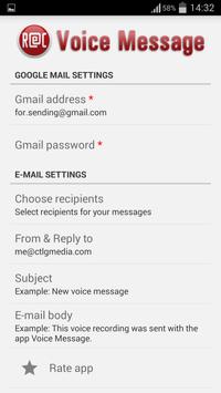 - Your first 3 voice messages are sent via our email account so that you can see how the app works. If you want to continue using it you will have to enter a Gmail account in settings, which will be used to send further messages.