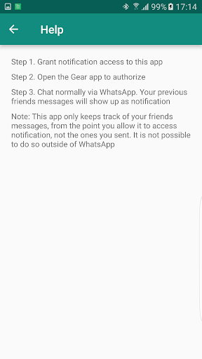 - Dedicated Gear app for viewing previous messages of your friends. Even works when there is no Bluetooth connection.