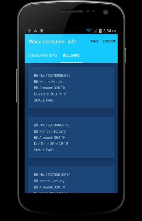هذه الخدمة التطبيق يسمح لمستخدميها (الزبائن) للدخول إلى حسابات العملاء WASA بهم. وهذا التطبيق عرض ملف تعريف المستخدم عند تسجيل الدخول بنجاح. وقد تم تصميم هذه التطبيقات لاسترداد معلومات الفواتير للعملاء من (شكل فاتورة) الخادم WASA. العملاء سوف تكون قادرة على العثور على تفاصيل الاشتراك الشهرية حتى الآن. مخازن التطبيقات المعلومات الضرورية بعد أول دخول ناجح والذي يسمح للمستخدم لاستخدام هذا التطبيق من دون أي اتصال بالإنترنت (في وضع دون اتصال). هذه التطبيقات تسمح لمستخدمها (العملاء) للحصول على التحديثات الفواتير العادية مباشرة من WASA، لذلك، لا تدخل طرف ثالث هو ضروري. ويمكن للعملاء الحصول على تفاصيل الاتصال في هذا التطبيق إذا كانت لديك أي استفسارات أخرى بخصوص فواتيرهم. وقد تم تصميم واجهة المستخدم هذه التطبيقات في (UI) على أساس الروبوت المصاصة UI، والذي يعطي هذا التطبيق، فضلا عن نظرة جديدة ومصقول سهل الاستعمال.