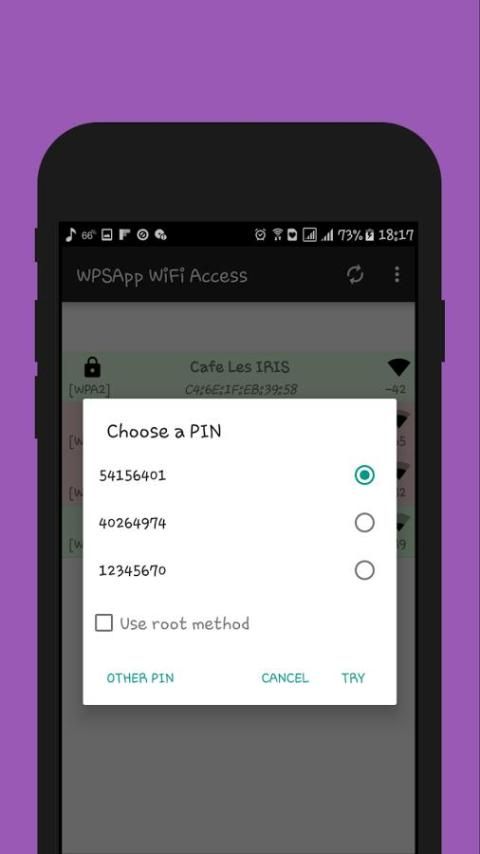 يستخدم هذا التطبيق هذه المسامير في محاولة الاتصال ومعرفة ما اذا كانت الشبكة الضعيفة. وتنفذ عدة خوارزميات معروفة لتوليد دبوس وبعض الدبابيس الافتراضية. يحسب أيضا المفتاح الافتراضي لبعض أجهزة التوجيه ويسمح لك لعرض كلمات السر واي فاي المخزنة على الجهاز.