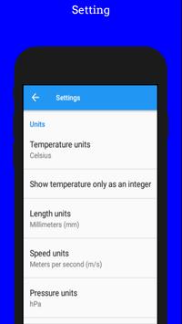 - Change unit setting: Temperature (C/F), Time format (12h/24h), Precipitation (mm, inch), wind speed (km/h, mi/h, m/s), pressure (mmhg, hPa, mbar)