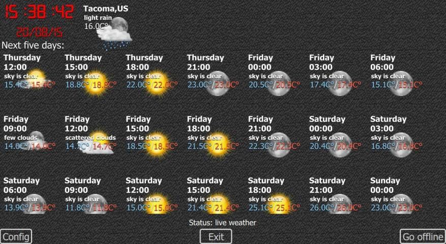 - يعرض حالة الطقس الحالية وتوقعات الطقس في الأيام القليلة المقبلة على نفس الشاشة