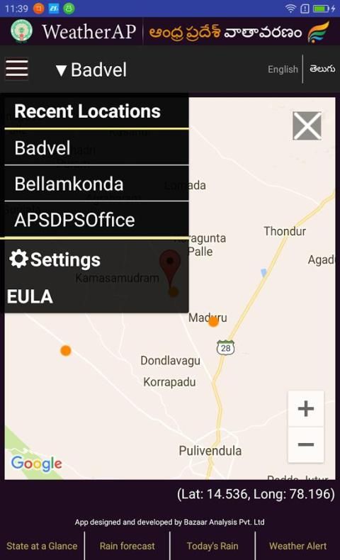 يوفر هذا التطبيق موقع تستند إلى الوقت الحقيقي مقاييس الطقس التي تم جمعها عن طريق شبكة من 2000+ محطات الأرصاد الجوية في ولاية أندرا براديش (الهند).