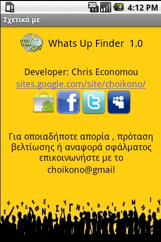 ANDROID 1 6 android 2 1 Whats39;s up Finder What39;s UpM Cosmote What39;s Up What39;s Up . , What39;s Up, .Application for users of the greek mobile provider Cosmote Whats Up.Find out if a users number belonds to this provider so you can use the benefits of the provider with this spesific user. app site developer . tags: Cosmote mobile phone Whats Up sms 1500 What39;s Up Greece Hellas my