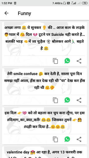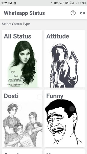 في هذا التطبيق، يمكنك رؤية جميع أنواع أحدث حالة Whatsapp في الهندية. أفضل ميزة التطبيق هذا هو نسخة حالة WhatsApp والأسهم في أي مكان تريده.