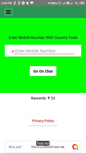 واجهة التطبيق هي بسيطة جدا وسهلة الاستخدام. يمكنك توجيه إدخال رقم هاتفك المحمول برمز بلدك واضغط على زر تشغيل الدردشة. ثم سوف تعيد توجيه إلى تطبيق Messager الخاص بك مع فتح الافتراضي. تم إدخال الرقم.