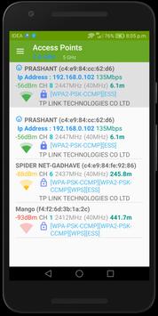 Analyse Signal Strengths, Security Types, Mac Address, Vendor Details, Channel Rating, Approximate distance from device of all available WiFI Signals. (access point)