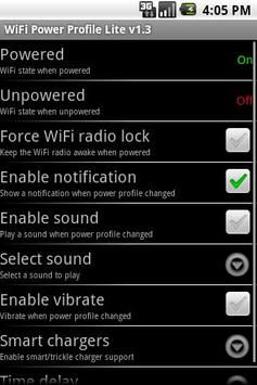 In addition, WiFi Power Profile will notify the user of the power change with a user definable sound or vibrate.