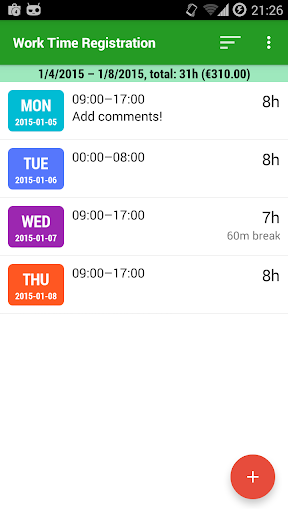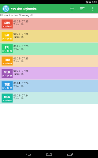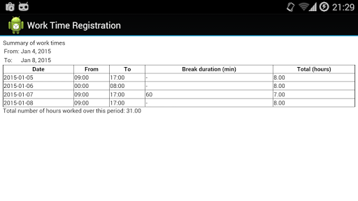 This application will take care of your work time registration. Save the times you have worked and check them in a nice looking summary. Filter your work times on start- and end date and see how many hours you have worked that period. Export them in a easy-printable HTML format!