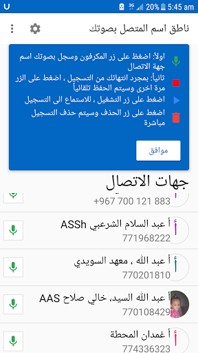 في تطبيقي ستتمكن من تسجيل اسم جهات الاتصال الخاصة بك واحدًا تلو الآخر بصوتك الحقيقي ، ومع لهجات مختلفة.