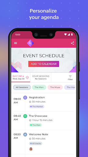 • اختر واختر الجلسات التي تهمك لإنشاء جدول أعمالك الخاص لهذا الحدث. أضف جلسات إلى تقويم هاتفك للبقاء في صدارة يومك.
