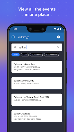 يضمن تطبيق Zoho ' ؛ S -Backrotsage تطبيق الجوال أن حضور حدث لم يعد مجرد تمرين ، ولكنه تجربة يجب تذكرها. احصل على معلومات الحدث ، والرد على المتحدثين في الوقت الفعلي ، وتخصيص جدول الأعمال ، وأكثر من ذلك ، كل ذلك في تطبيق واحد.