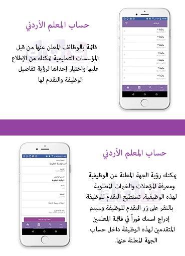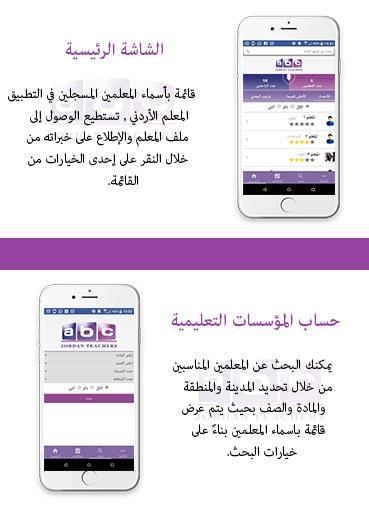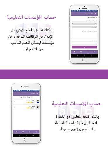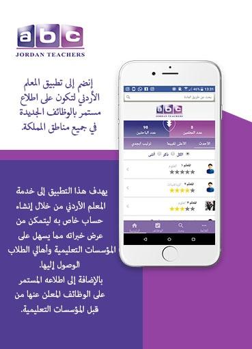 تطبيق المعلم ... هو التطبيق الأول من نوعه والذي يهتم بالمعلم واحتياجاته, كما يهتم بالطلاب والمؤسسات التعليمية من جهة أخرى. يطرح هذا التطبيق قائمة كبيرة من المعلمين الأردنيين بحيث تتمكن المؤسسات التعليمية وأهالي الطلاب من البحث عن المعلم المنشود بكافة طرق البحث, إما عن طريق المرحلة التعليمية أو المادة أو نوع التعليم. كما تستطيع المؤسسات التعليمية طرح وظائفها ويقوم المعلم بالتقدم لهذه الوظائف من خلال التطبيق. التطبيق متاح باللغتين العربية والانجليزية.