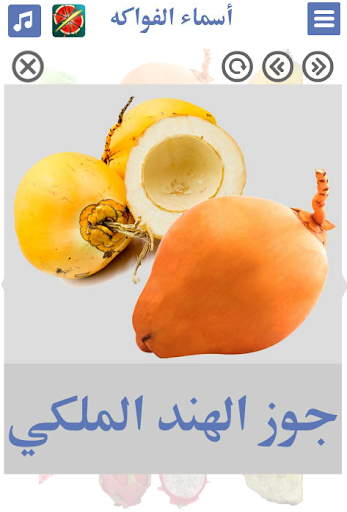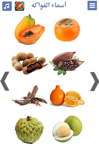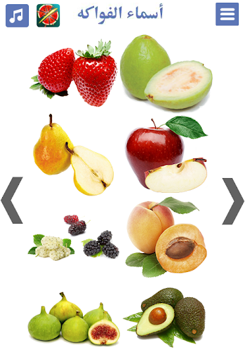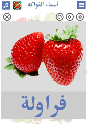 التطبيق يعرض اسماء الفواكه و قائمة الفواكه التالية: فراولة، إجاص، توت، تين، جوافة، تفاح، مشمش، أفوكادو، موز، صبار، عنب، كيوي، ليمون، مندلينا، مانجا، شمام، برتقال، أناناس، رمان، كرز، بطيخ، تمر، خوخ، جوز الهند.