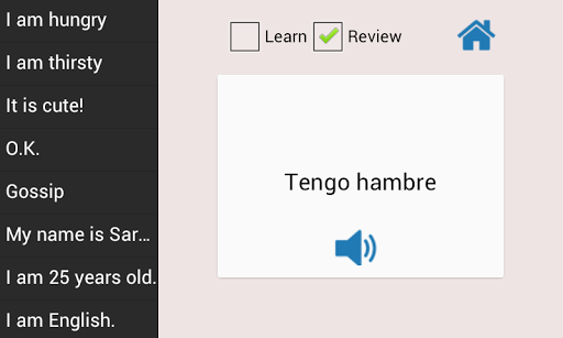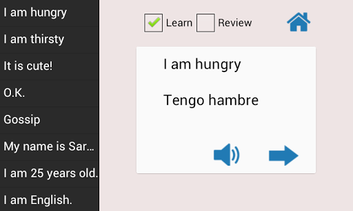 Learn Spanish Language Lets you learn Spanish language with your Device at any place you may want to Read the sentences, listen and repeat. Practice anywhere you go, Useful app for tourists and business people who travel to Spain, Latin America, Mexiso or elsewhere. Learn basic Spanish conversational skills, Learn Spanish vocabulary with general words, and conversation phrases, Voice recorded by native Spanish speakers you can exercises to test what you have learned. Integrated Alphabet Writing helper and Visual images to practice with.