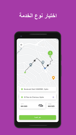ما عليك الا اختيار موقعك الحالي, نوع الخدمة التي تود اسعمالها و الوجهة. سيعرض عليك التطبيق أجرة الرحلة و زمن الانتظار.