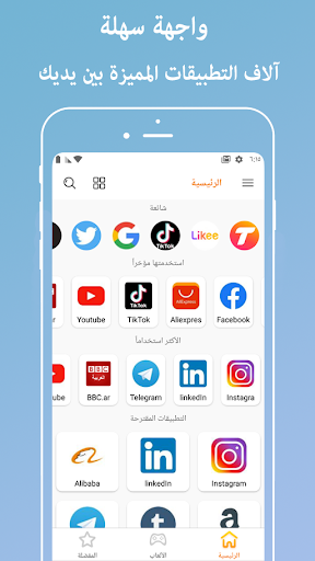 🎮 سهولة الوصول والاستخدام من خلال تصفح تطبيقات المراسلة المباشرة وتطبيقات الفيديو والفيديو على YouTube ، بما في ذلك تطبيقات البث المباشر للألعاب مثل Nimo TV , Tango وتطبيقات المراسلة الفورية مثل Telegram في تطبيق واحد.