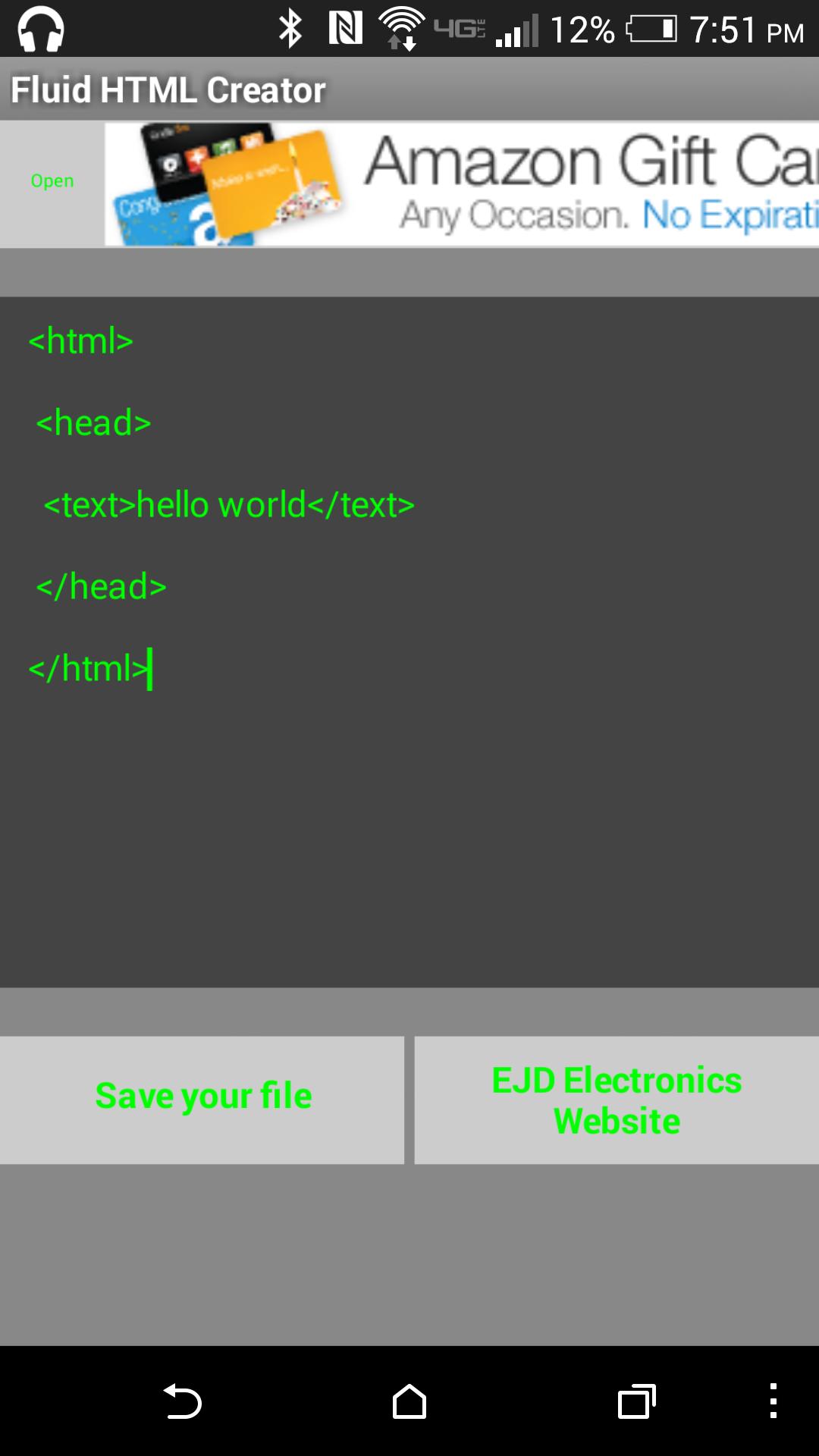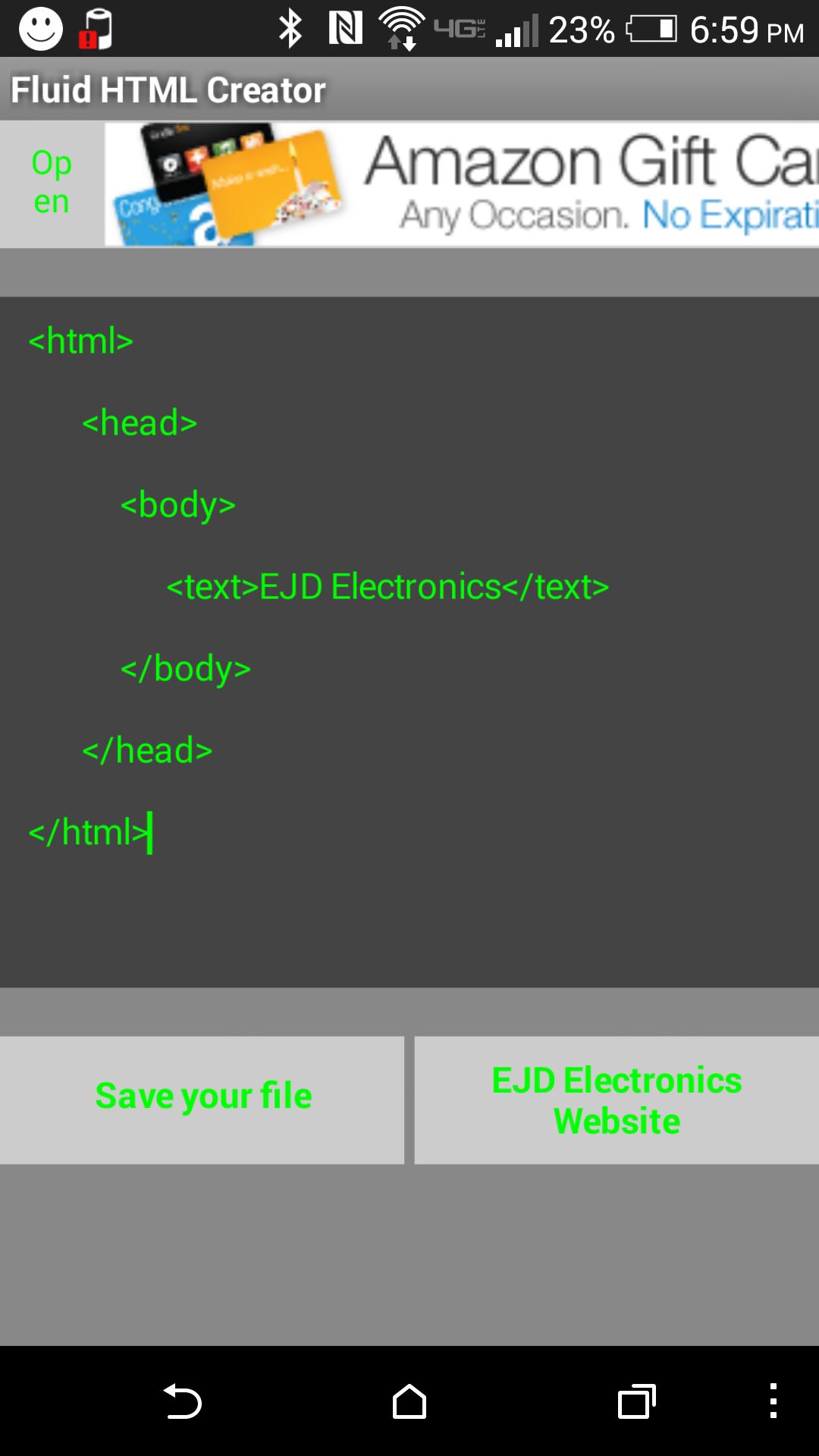 Simply create, change the file extension from .txt to .html, and upload it to your site (the HTML file is saved in the phone storage by default as mycode.txt, but you can change the extension and filename to suit your needs).