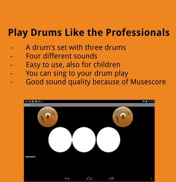 Play Drums Play the drums like a professional! The drums have a very good sound quality. Features: 3 drums with different sounds 2 cymbals Easy to use. Keywords: drums, play, english