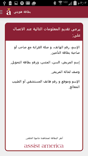 أسيست أمريكا هي المزود الأول العالمي للخدمات الطبية الطارئة للمسافرين الذين يصابوا أو يمرضوا أثناء سفرهم أكثر من 100 ميلا (150 كيلومترا ) من مكان اقامتهم، أو أثناء وجودهم في بلد أجنبي. سيحصل العملاء الذين لديهم تغطيتنا من خلال منتج شركة التأمين الاستفادة من هذا التطبيق كالأتي: اتصال بلمسة واحدة إلى مركز عملياتنا والحصول على معلومات ما قبل الرحلة و أسيست ألرت، كما يمكنهم اكتشاف أقرب موقع لسفارة الولايات المتحدة. أسيست أمريكا تقدم خدماتها حصريا من خلال منتجات شركة التأمين و غير متوفرة للبيع الفردي.
