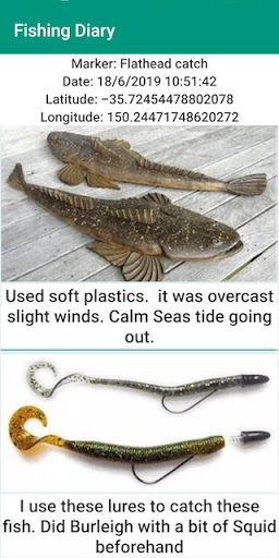 My Fishing Diary يسمح لك أيضا بالتنقل إلى مواقع الصيد المفضلة لديك في تاريخ لاحق. سهولة القراءة ومتابعة الرسومات تتيح لك تحديد وإيجاد بقعة باستخدام GPS. ليس من الصعب متابعة مراجع الخريطة أو خط العرض والطول، فقط اتبع الخط الأحمر إلى المكان الذي اخترته. تظهر الخط الأبيض حتى عنوانك الحالي بحيث من السهل معرفة طريقة التنقل. إنه من السهل!