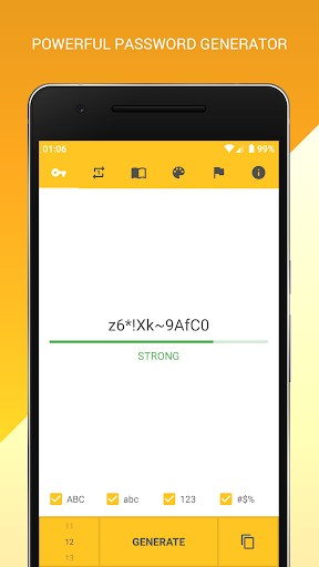 Set uppercase and lowercase letters, numbers, special symbols and length to generate passwords that are impossible to crack. The application will tell you how strong the password you have generated: "power" is displayed on an animated strip.