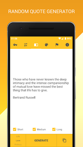 There is a huge library of sayings of famous personalities from different centuries in the app. Set the length and the theme to get a needed random quote. You can also generate random quotes on completely different topics.