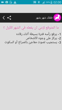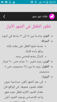 تطور الطفل تطبيق بدون أنترنت خاص بنمو الطفل خلال عامه الاول حيت تعد السنة الاولى فى عمر الطفل هى اهم مراحل نمو الطفل ففيها سيدتي تحدث الكثير من التغيرات فى نمو الطفل الرضيع الجسمانى والعقلى والنفسى والادراكى ولذلك اذا كنت حامل او انجبتى قريبا فعليك ان تتعرفي على مراحل نمو الطفل و تطوره شهر بشهر بعد الولادة وكيف يتغير الطفل خلال عامه الاول وذلك لكى يكون من السهل فهم الطفل و تدارك اى مشكلة فى نمو الطفل وعلاجها كما ان معرفة مراحل تطور الطفل الرضيع تساعد كثيرا فى العناية به بشكل صحي وسليم وتجعل الام تتفادى الكثير من الاخطاء التى تسقط سهوا نتيجة لعدم معرفتها جيدا لمراحل نمو الطفل وما الذى يجب فعله فى كل مرحلة ولذلك اذا كنت تسعين الى العناية بطفلك بشكل جيد ومنحه نمو وتطور سريع وفعال فعليك بتطبيق دليل تطور الطفل و تعرفي على اهم المعلومات و النصائح الطبية شهر بشهر خلال عامه الاول وكيف يمكن التصرف والعناية به فى كل شهر .