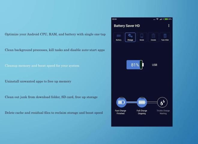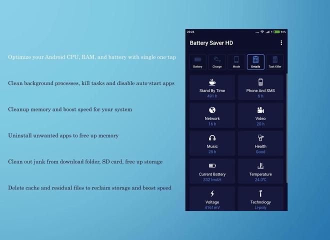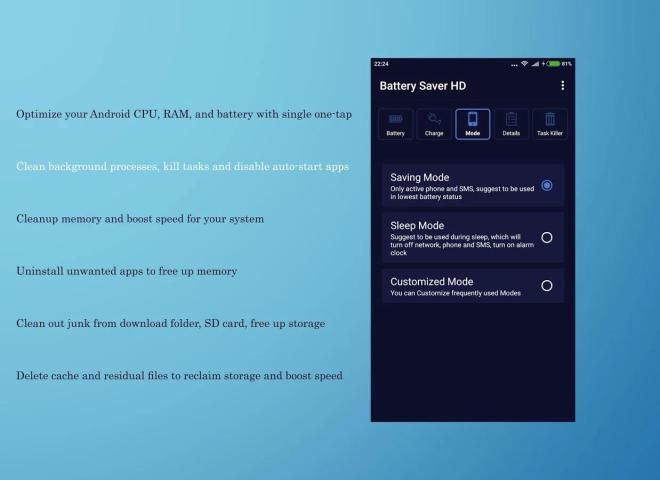 ق قوية الروبوت البطارية التوقف ومحسن الطاقة. وتشمل وظائف بنقرة واحدة البطارية محسن وضع توفير البطارية (النوم العميق) البطارية المستهلكة التطبيق المقتفي نسبة البطارية القطعة النشاط المتبقية الوقت مقدر زيادة تهمة شاشة التوقف!