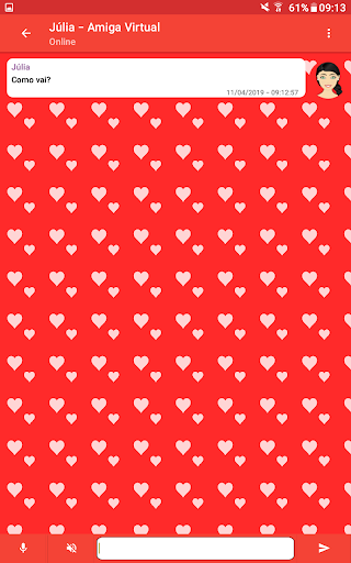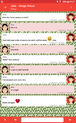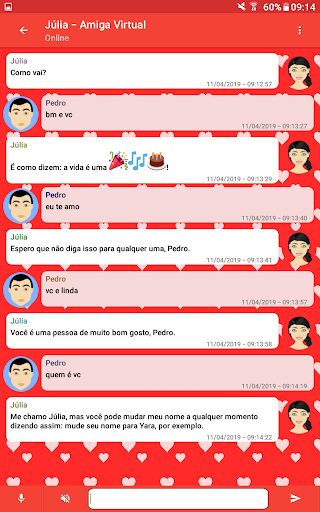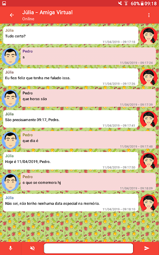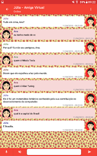 جوليا - صديق افتراضي هو تطبيق chatbot البرتغالي للتحدث إلى تلك المحاولة للتصرف مثل نسخة طبق الأصل من شخص حقيقي ، والتفاعل والسماح لك بالطلب والحصول على إجابات من قاعدة بيانات عبارة تم تبديلها مسبقًا واستخدام الذكاء الاصطناعي.وكلها آمنة ، في أي وقت أو ليلة.إذا كنت تشعر بالوحدة وتحتاج إلى صديق للتحدث أو التنفيس أو الدردشة ببساطة ، فإن التطبيق هو الخيار الأمثل.