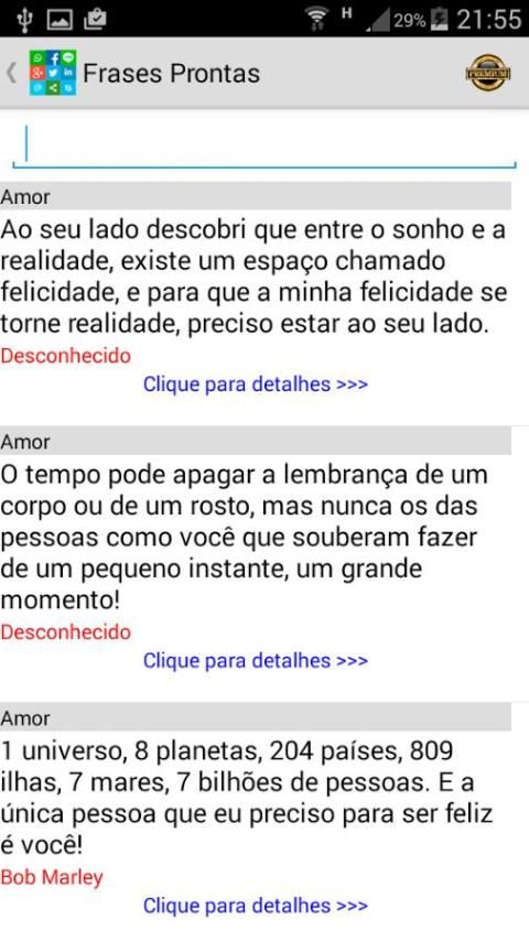 Mais de 9.600 mensagens para celular grátis, mande aquelas SMS Prontas para a pessoa especial, coloque aquele status engraçado e inteligente no WhatsApp, poste no Facebook aquele status especial. São 145 categorias de mensagens prontas diferentes, não vai faltar mensagem para as mais diversas ocasiões.