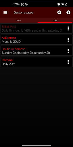 ★ الحد من استخدام التطبيق يوميًا ، في شهر أو يوميًا من الأسبوع.يتطلب إما الجذر ، استخدام 3C Companion (https://3c71.com/3cc) أو تنشيط خدمة إمكانية الوصول.
