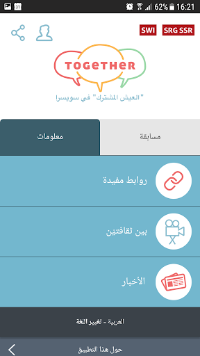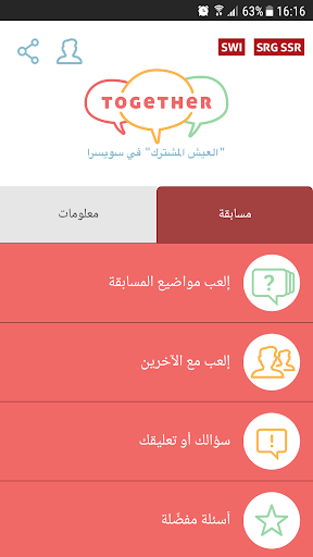 حاول أن تختبر إلى أي حد أنت تعرف سويسرا، واحصل على الإجابات التي لا تزال مترددا حولها. ويمكنك أن ترسل إلينا بأسئلتك الخاصة، وأن تكتشف موضوعات محدّثة بإستمرار، وأن تلعب مع أفراد أسرتك او أصدقائك. وهذا التطبيق، إضافة إلى كل ما سبق، متوفّر بسبع لغات: العربية، والألمانية، والإنجليزية، والبرتغالية، والفرنسية، والإسبانية، والإيطالية.