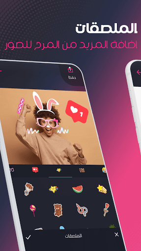 • اضف المزيد من المرح لصورك عن طريق مجموعة مميزة من الملصقات المجانية مثل ملصقات حب وملصقات مضحكة وملصقات صباح الخير وغيرها تجدها في تطبيق المصمم المحترف كما يمكنك اضافة أكثر من ملصق علي الصورة والتحكم في حجم ومكان الملصق.