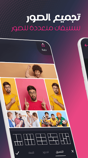 • قم بتجميع صورك في اطار واحد بخطوات سهلة مع قوالب وإطارات مختلفة مع ميزة تجميع الصور أو دمج الصور التي نوفرها لك في تطبيق مصمم الصور الاحترافي، هذه الميزة تتيح لك التحكم في تجميع الصور بشكل كامل حيث يمكنك تغيير المقاسات وتطبيق الفلاتر واضافة نص بسهولة.